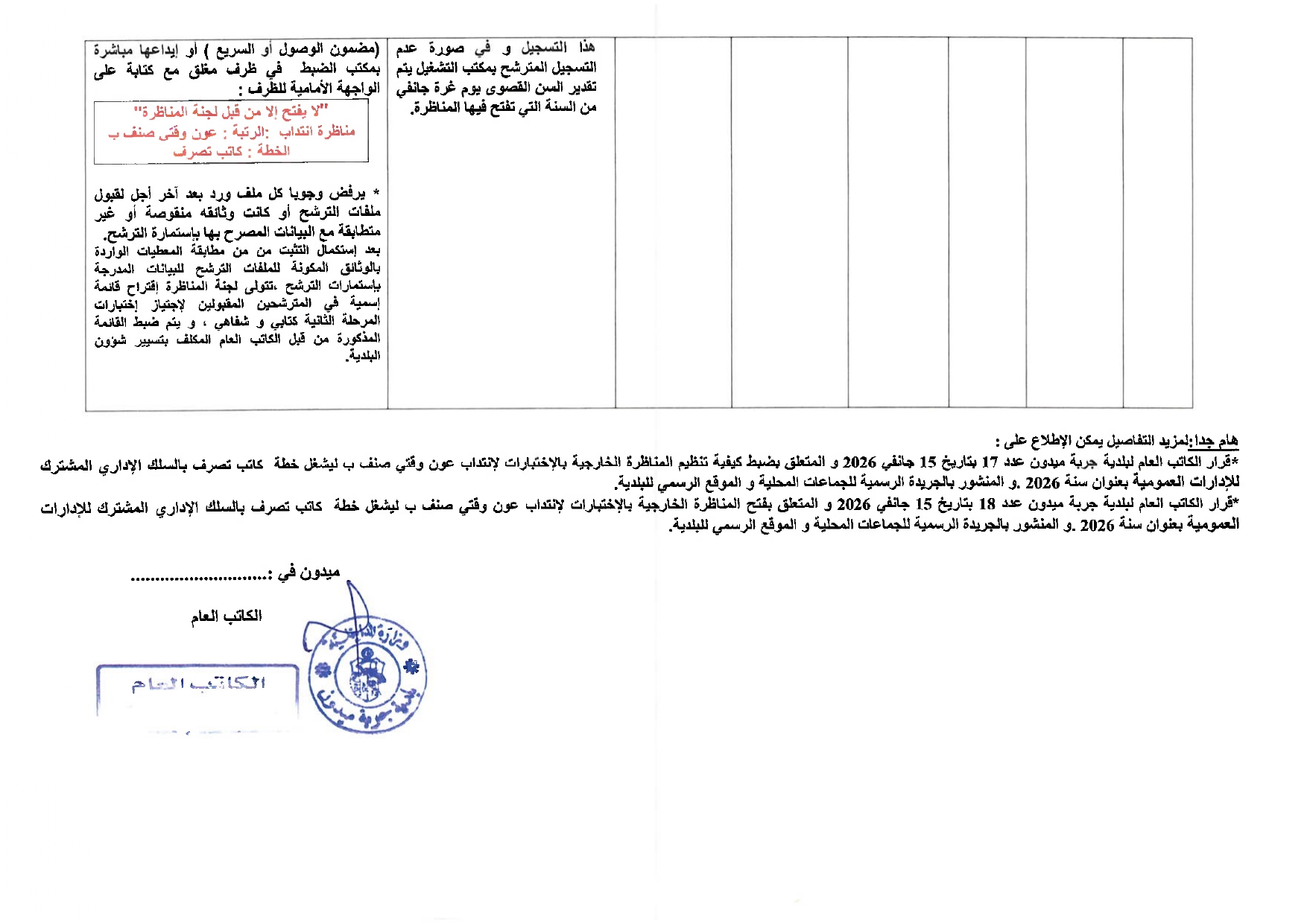 بلاغ مناظرة خارجية بالاختبارات لانتداب أعوان واقتيين من صنف ب ليشغلو رتبة كاتب متصرف